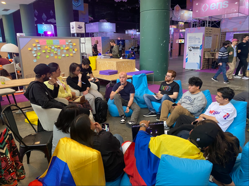 Ximena Monclou tomó el micrófono en este stand, uniendo a diversas comunidades de Ethereum de Latinoamérica para conversar y fortalecer lazos. Este espacio fue moderado por Suka de SeedLatam y Ximena, nuestra voz por Ethereum Medellín. Ximena compartió los avances de nuestro ecosistema local, destacando el gran auge que ha tenido la tecnología Blockchain y cómo se viven eventos educativos en nuestras universidades.